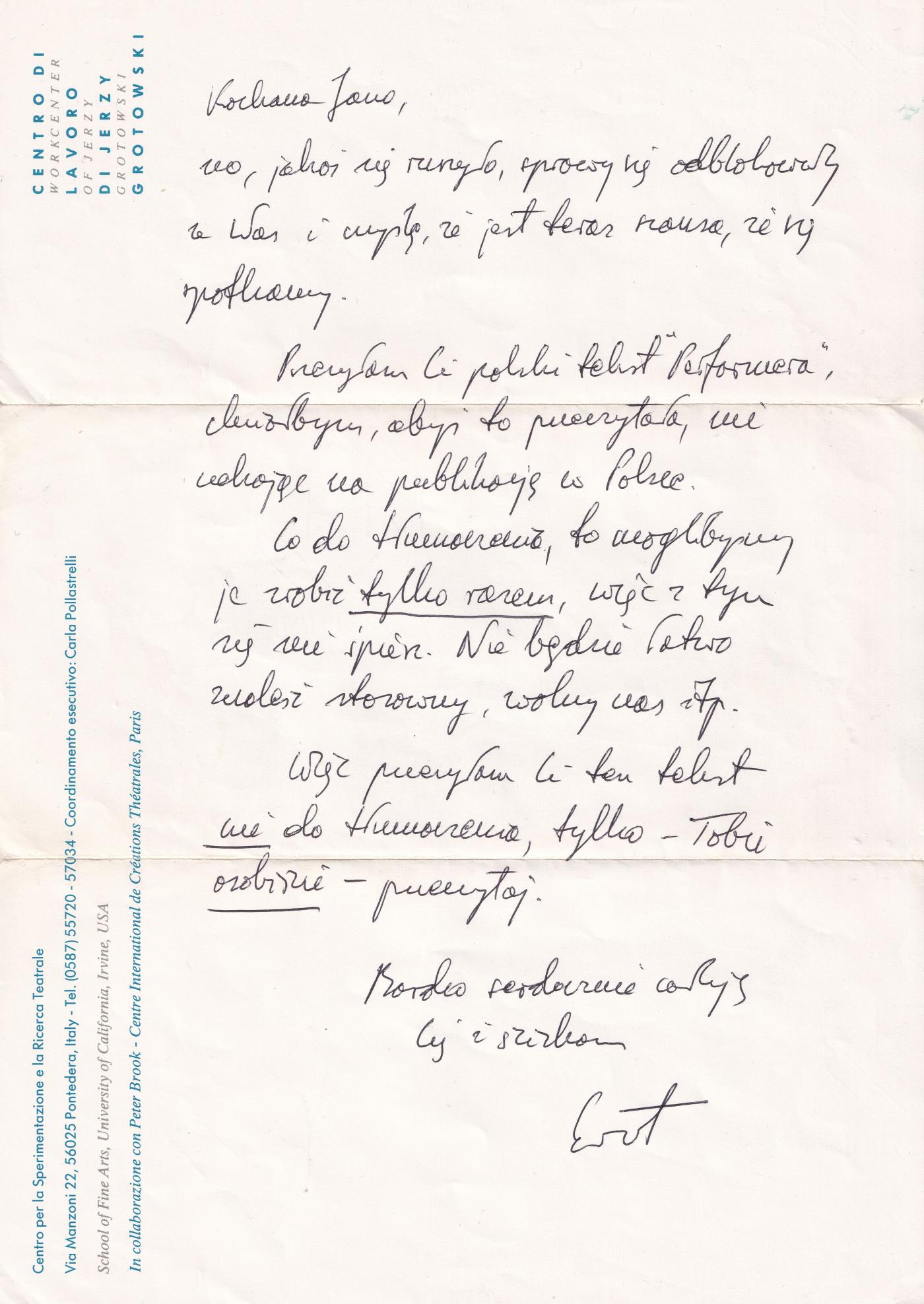 Pokračuj, pokračuj! Pokračovala jsem, žila jsem tak v běžném provozu za normalizace, při starosti o děti, při vaření i překládání. Tím jsem si udržovala kontakt s Grotowským – překládala jsem jeho staré i nové texty, které mi posílali přátelé. V Polsku měli skvělé kulturní časopisy (Dialog, Odra) i knihy u nás zakázaných autorů (Carl Gustav Jung, Claude Lévi-Strauss, Mircea Eliade, Hannah Arendt). Objevila jsem, že doopravdy čtu, až když překládám, a když se člověk cítí ztracený a neví, jak dál, překlad ho vede a on zažije, že může víc, než si myslel...