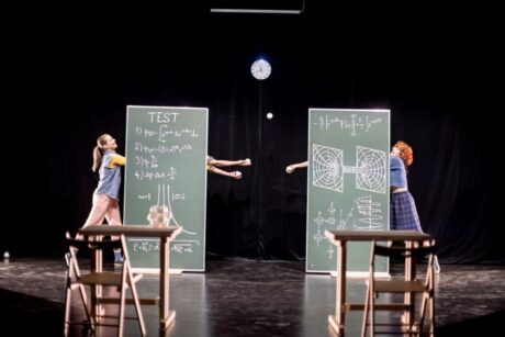 Princip nejistoty spojuje kvantovou fyziku s nonverbálním divadlem. Foto archiv souboruVše začíná v jakési fiktivní třídě s dvěma lavicemi a tabulemi v pozadí, popsanými množstvím vzorečků. Zároveň třída vypadá trochu jako experimentální laboratoř, kde se mohou dít hodně podivné věci. Postupně se do hravého souboje s problematikou kvantové fyziky, jen chvílemi upřesňované základními informacemi, pouštějí dva žongléři, akrobatka a tanečnice (Hannah Lenox, Michaela Stará, Aleš Hrdlička a Filip Zahradnický).