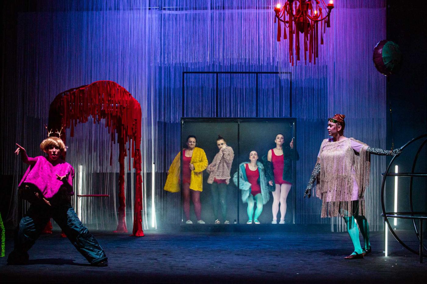 Úterní dopolední inscenace, kterou byl festival zahájen, patřila klasikovi Williamu Shakespearovi a jeho jedné z nejhranějších komedií Snu noci svatojánské. O nastudování Janky Ryšánek Schmidtové jsem podrobněji psal v tištěných divadelních novinách 7/25. Režisérka propojila text s výraznou, místy až surrealistickou vizuální stylizací. Lenka Hollá zasadila scénu a kostýmy do doby přelomu 80. a 90. let minulého století, z konceptu však není zřejmé, proč si tvůrci vybrali právě tuto dobu. Přesto výprava spolu s originální hudbou Vladivojny La Chia vytvářejí vcelku věrohodnou atmosféru magické svatojánské noci.