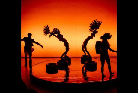 Příběh oživují atraktivní stínové scény. Foto Dan KvapilDěj příběhu v několika časových skocích vlastně postihuje vývoj vztahu lidí k černému zlatu, ropě, tedy nejbohatšímu energetickému zdroji nejrůznějších odvětví. Hlavní hrdinka May je vlastně jejím lidským symbolem (naposledy ji vidíme jako sochu pokrytou ropou v muzeu budoucnosti). Poprvé se ovšem s May setkáváme v roce 1889 v rodině Singerových, která se navzdory chudobě nechce vzdát své farmy v Cornwallu. Těhotná May okouzlená fascinující vůní kerosinu odchází vstříc neznámé budoucnosti. Poté se s ní setkáváme jako se služebnou v Persii, v Teheránu na počátku 20. století, která je pod nadvládou Británie, vytěžující nerostné bohatství zdejší země. V roce 1970 se May stává generální ředitelkou mezinárodní ropné společnosti, kterou ohrožuje libyjský návrh znárodnit její majetek. A v roce 2021 se ocitá v Iráku, kam natruc utekla její dcera Amy. Právě dramatický vztah matky a dcery v proměnách času a paradigmatu je druhou (nebo první?) dějovou linkou hry. Obě ženy nakonec potkáváme tam, kde celý příběh začal – totiž na farmě v Cornwallu. To už je ovšem budoucnost, rok 2050, kdy věk ropy (vzhledem k vyčerpání zásob) končí a stává se stejně jako hrdinka May pouhým historickým faktem.